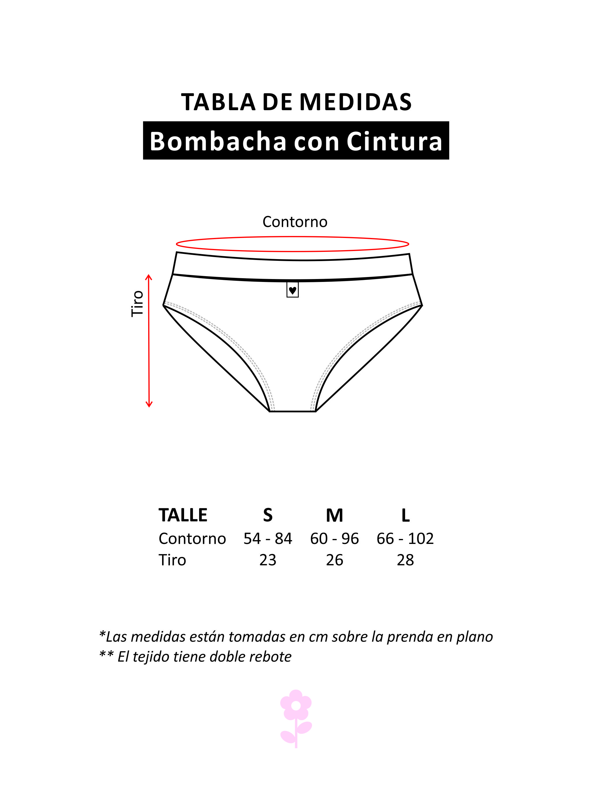 Bombacha con cintura ancha de doble tela, para sostener sin apretar. La tela es algodón y lycra. DATO: Esta bombacha es la continuación de la bombacha con cintura de Nena. Osea que es la misma moldería pero en talles más grandes.